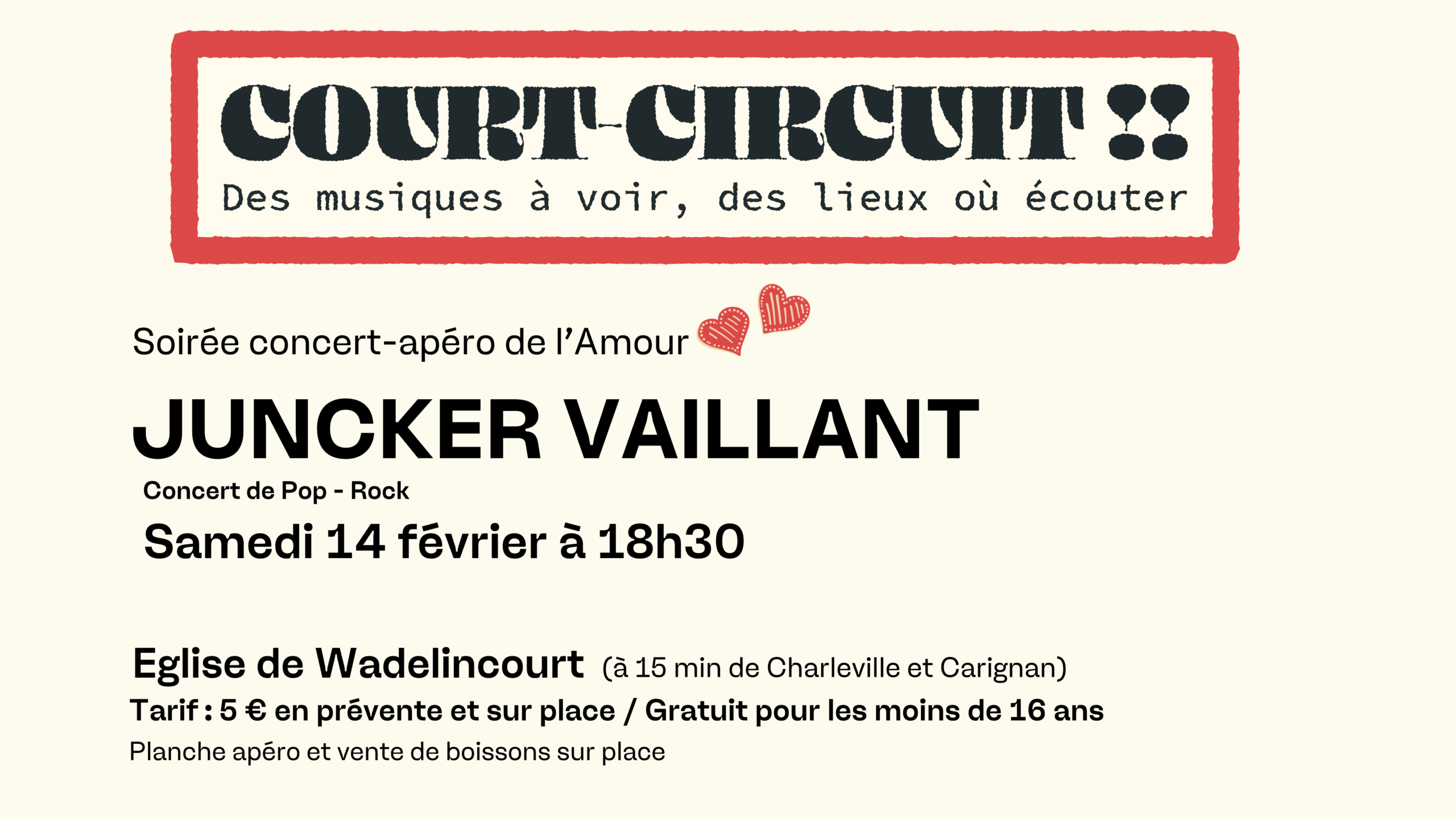 Vivez l'expérience d'un concert à l'église de Wadelincourt de Folk avec le groupe JUNCKER VAILLANT pour le jour2 de Court-Circuit d'hiver le samedi 14 février 2026 à 18h30. COURT - CIRCUIT !! Des musiques à voir, des lieux où écouter « Court-Circuit !! » c’est le nom du projet que l’association Sapristi !! a choisi […]