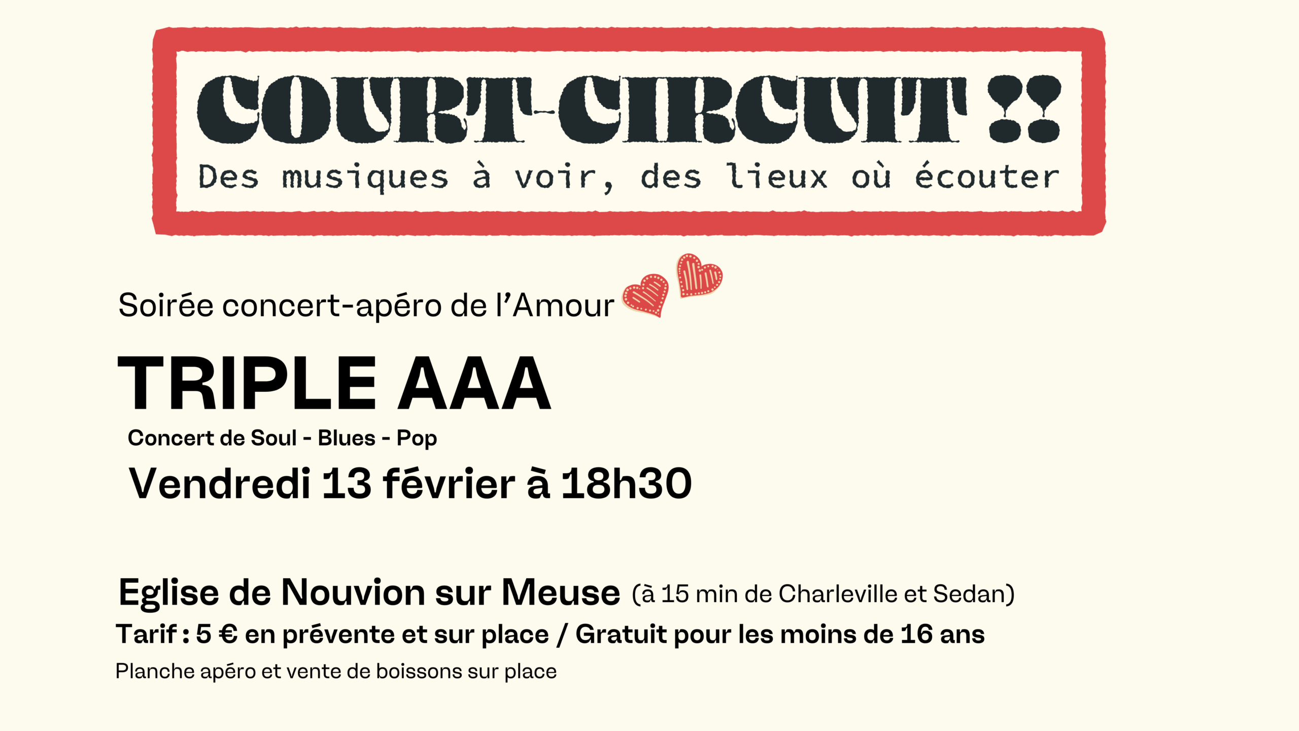 Vivez l'expérience d'un concert à l'église de Nouvion de Blues avec le groupe Triple AAA pour le jour1 de Court-Circuit d'hiver le vendredi 13 février 2026 à 18h30. COURT - CIRCUIT !! Des musiques à voir, des lieux où écouter « Court-Circuit !! » c’est le nom du projet que l’association Sapristi !! a choisi […]
